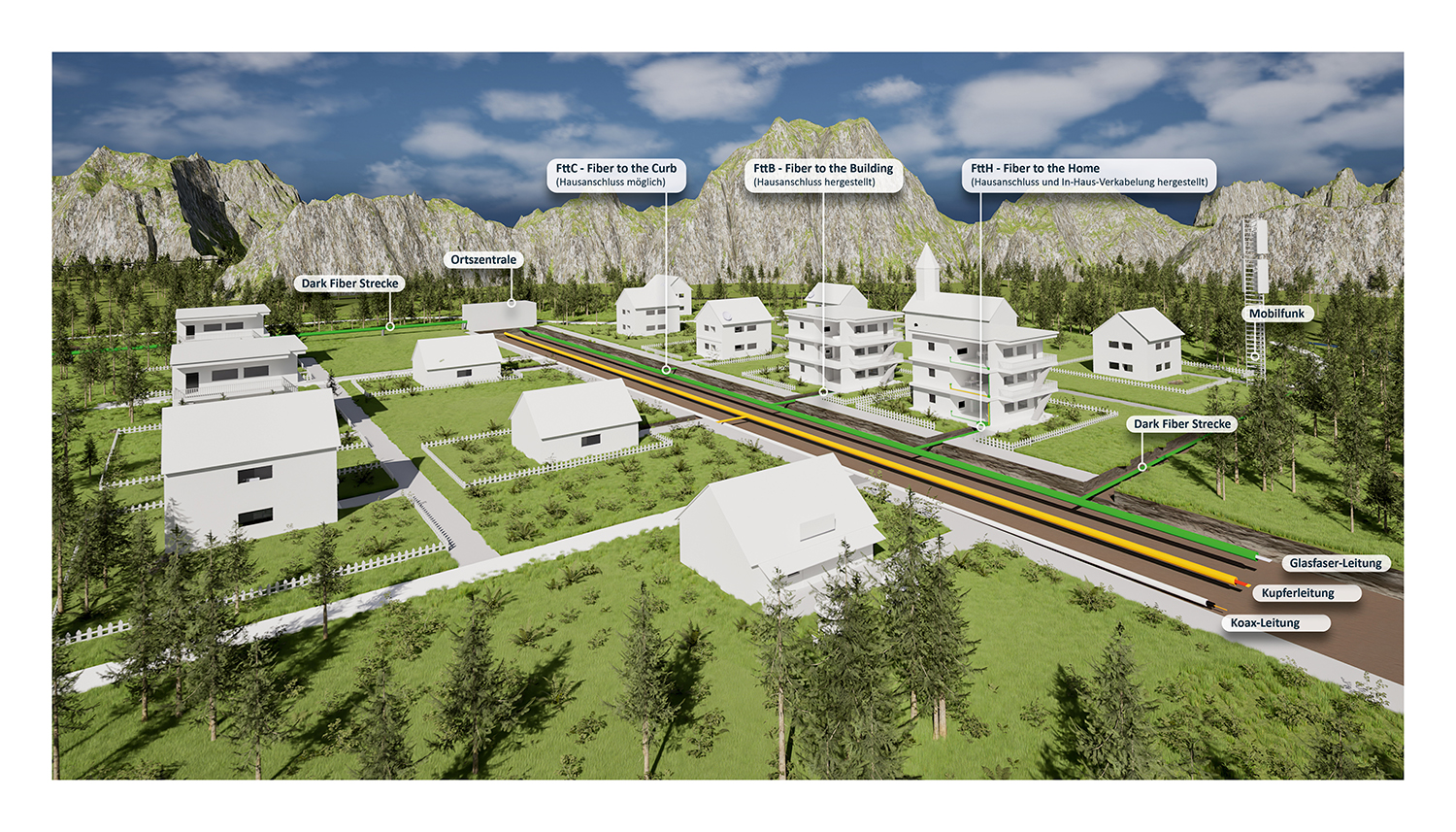 Wenn Ihre Gemeinde über ein eigenes Glasfasernetz verfügt und ein Anschluss daran an Ihrer Adresse möglich bzw. geplant ist, setzen Sie sich mit Ihrer Gemeinde in Verbindung, um Details zu Prozedere und Kosten des Hausanschlusses zu klären.